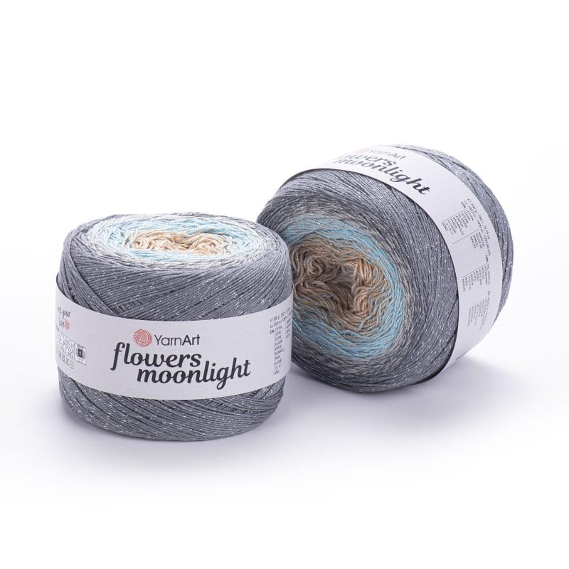 A gradient cake yarn with a metallic thread twist, composed of 53% cotton, 43% acrylic, and 4% metallic polyester. This yarn is ideal for festive shawls, party wraps, capes, or dresses. Its long color changes and elegant shimmer make every project unique and eye-catching, perfect for gifts or seasonal accessories.