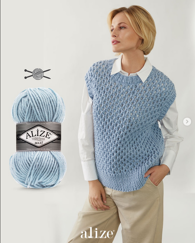 Alize Superlana Maxi is a bulky wool-acrylic blend yarn that’s soft, warm, and quick to work with. Perfect for cozy winter sweaters, chunky scarves, cardigans, hats, and home accessories.